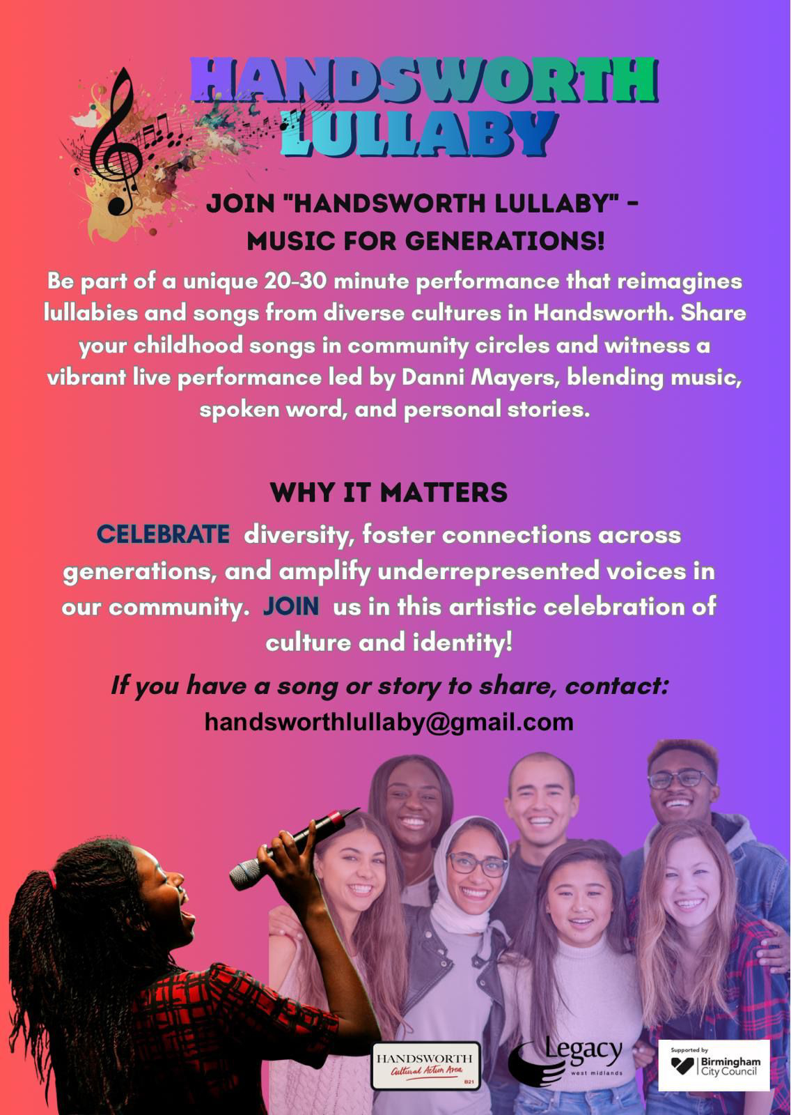 Commissioned in 2025 by Legacy West Midlands, in partnership with Handsworth Cultural Action Area and Birmingham City Council, the project invites local people to help shape a vibrant live performance taking place in May 2026 (date to be confirmed).