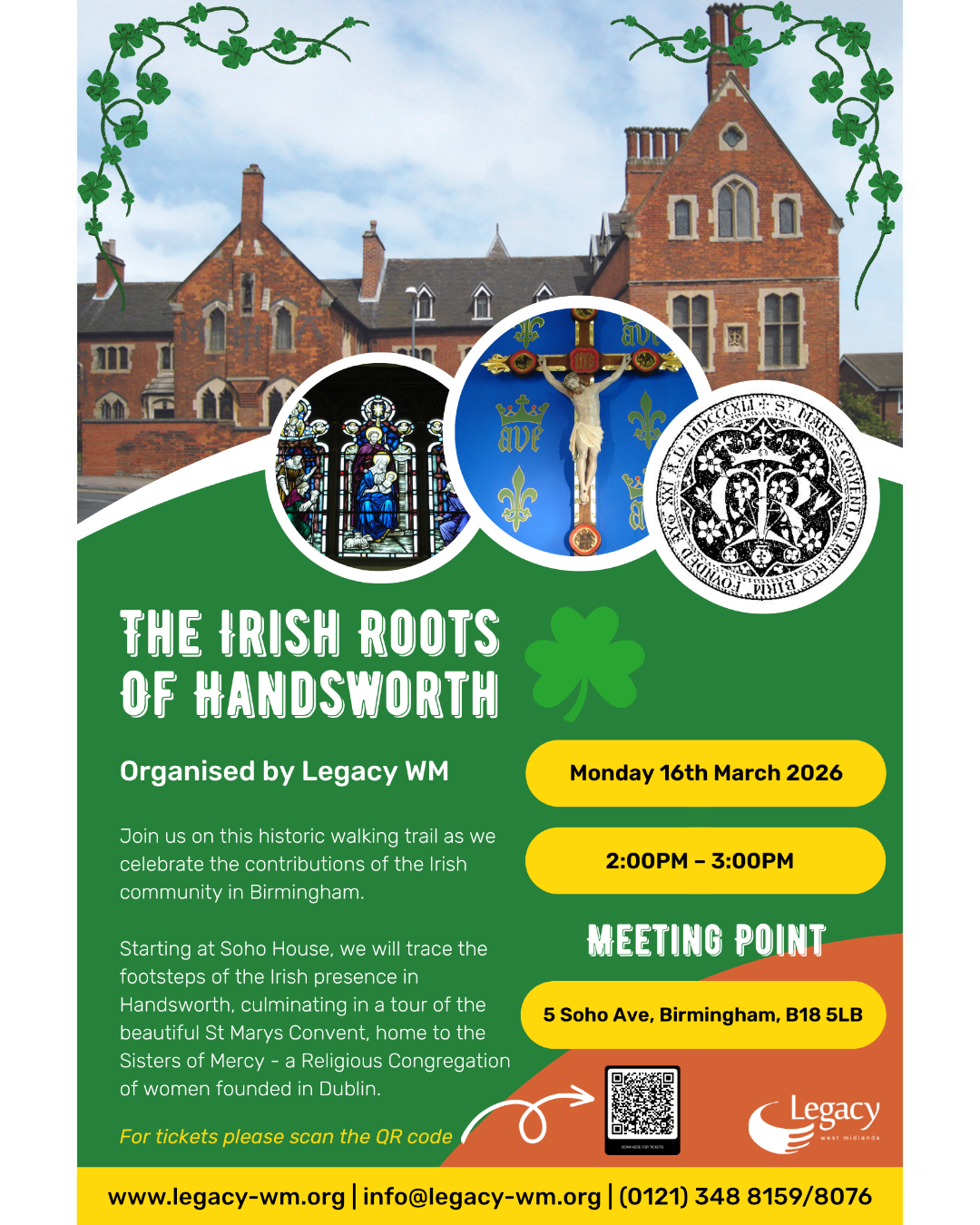 Join us on this historic walking trail as we celebrate the contributions of the Irish community in Birmingham. Starting at Soho House, we will trace the footsteps of the Irish presence in Handsworth, culminating in a tour of the beautiful St Marys Convent, home to the Sisters of Mercy – a Religious Congregation of women founded in Dublin.